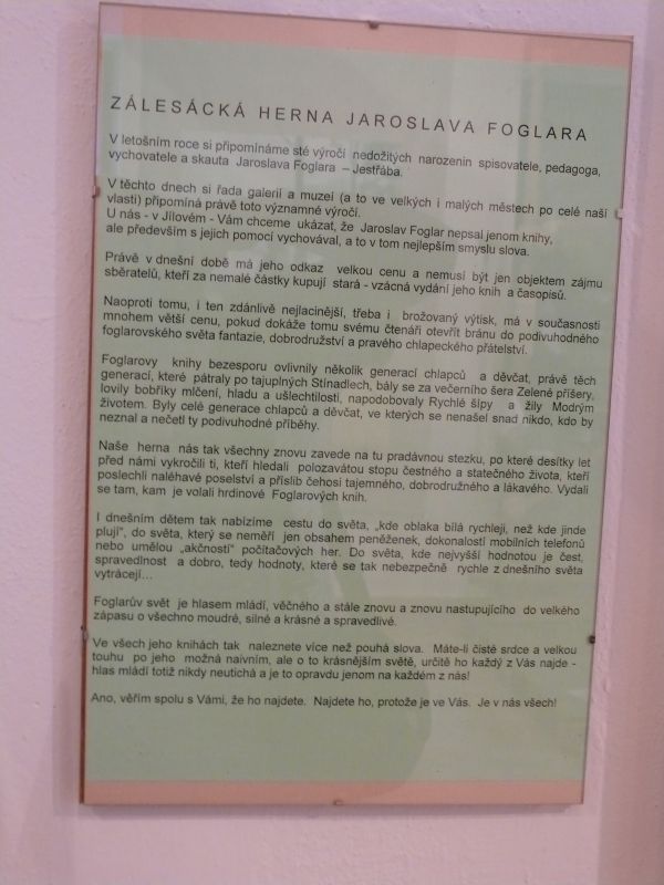 interaktivní výstava a herna ke 100. výročí narození nejznámějšího českého spisovatele chlapeckých románů, určená hlavně dětem "ZÁLESÁCKÁ HERNA JAROSLAVA FOGLARA ", kterou si můžete prohlédnout až do 8. září 2007.