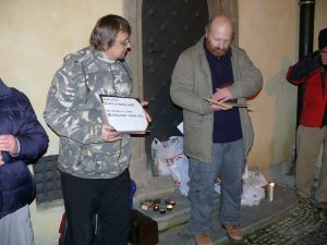 ![]() ![]() V další části hovořil Petr Molka - Best o stínadleských tajemstvích. Poodhalil roušku skrytých záhad, když vytáhl ze záhadné truhly podivné razítko ahovořil o vontském kalendáři? Pak došlo na rozdávání pamětních listů, kartiček a jejich razítkování. Autorem originálního barevného pamětního listu na letošní Večer světel (jistě se stane ozdobou sbírek) je opět Roman Liščák. ![]() ![]() když bylo vše rozdáno, začaly se na náměstíčku před kostelem objevovat mihotavé plaménky svíček tradičně připalované z jedné velké svíce. Ta letos byla úplně nová - stříbrná. Obvyklými formulemi vontské rady byl Večer světel oslaven, pak už každý účastník svoji svíčičku postavil na místo jemu nejbližší, kde jistě svítila dlouho do noci.