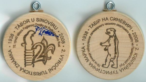 Silueta stožáru se třinácti zářezy a bobrem na vrcholku totemu však dnes zdobí nejen legendární tábořiště, ale i dřevěnou placku výroční turistické známky z ukrajinské kolekce těchto cestovatelských suvenýrů.