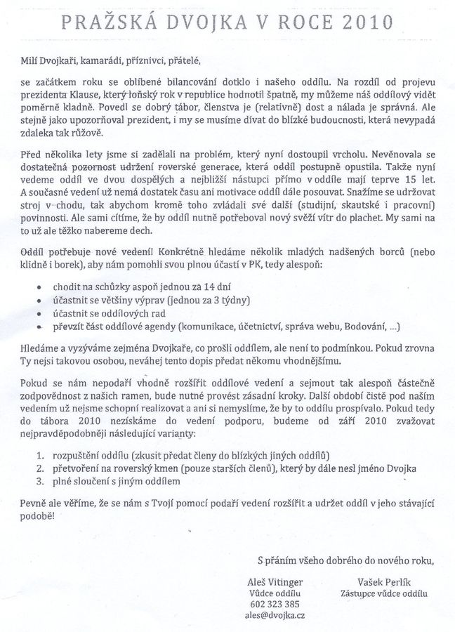 Vedení oddílu vydalo dopis „Pražská Dvojka v roce 2010“, ve kterém popisuje současnou situaci, hledá řešení, ale i seznamuje s možnými variantami dalšího působení oddílu, pokud by se celkem rychle nenašel zájemce o vedení.