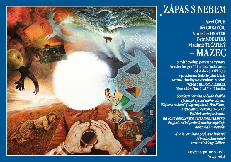 Pavel Čech, Jiří Grbavčic, Vratislav Hnátek, Petr Modlitba, Vladimír Tučapský = MAZEC si Vás dovoluje pozvat na výstavu obrazů a fotografií, která se bude konat od 2. do 28. září 2010 v prostorách Galerie Jižní křídlo Křížové chodby Nové radnice v Brně, vchod z ul. Dominikánská.