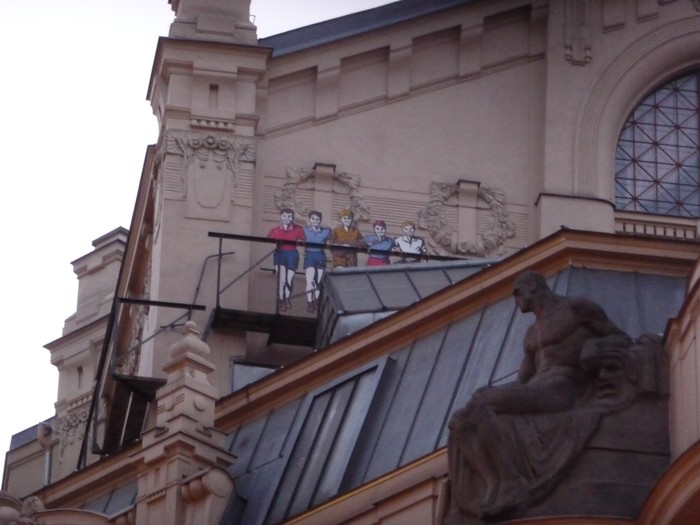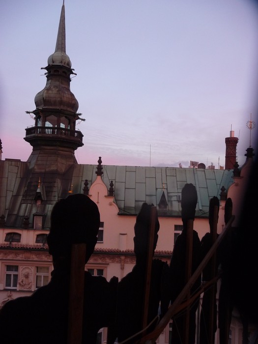 Na obrázku zvonice u Svatého Jakuba, hotel s ptákem Marabu (?) na střeše a probouzející se den.