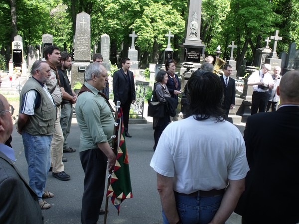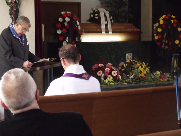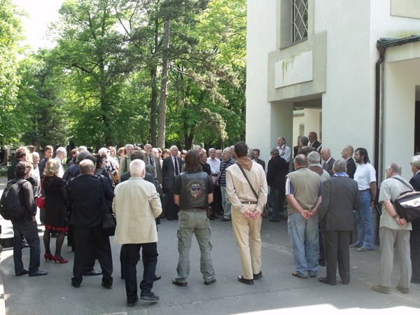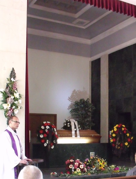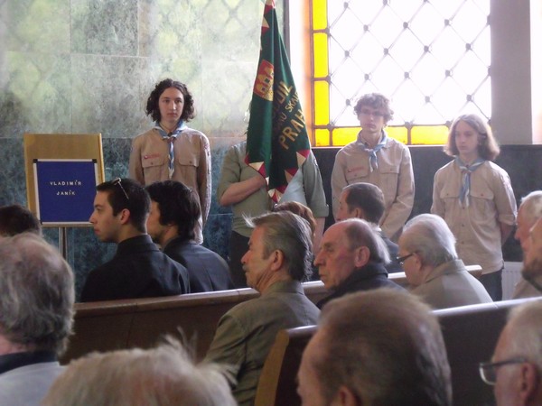 Jsem přesvědčená, že odtud viděl ve Strašnickém krematoriu svůj pohřeb a že se mu líbil. Přišlo tolik dobrých lidí, především skautů! I pan farář Szabó z farnosti sv. Antoníčka, kam rád chodil do kostela, měl úžasnou ,,skautskou” řeč. Nechali jsme mu hrát písničky z kazety, kterou spolu se skauty také nazpíval – Hoši od Bobří řeky zpívají. A po skončení obřadu mu venku lidé za doprovodu kytary jeho věrného kamaráda Jendy Klepáče a tuby Jana Střížovského zazpívali “My pluli dál a dál”.