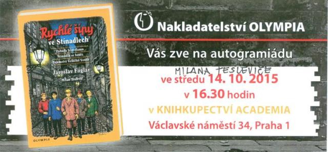 V souvislosti s druhým vydáním stínadelské trilogie Jaroslava Foglara Záhada hlavolamu, Stínadla se bouří a Tajemství Velkého Vonta pod názvem Rychlé šípy ve Stínadlech s ilustracemi Milan Tesleviče ve středu 14. 10. od 16.30 hodin pořádá nakladatelství Olympia autogramiádu známého ilustrátora v pražském knihkupectví Academia na Václavském náměstí č. 34.