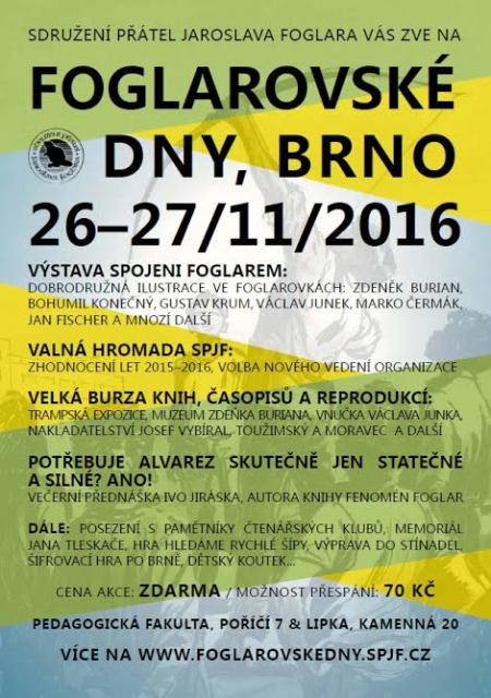 Foglarovské dny již za dva měsíce v Brně: 26.-27. listopadu 2016[ Autor: Sdružení přátel Jaroslava Foglara | zařazeno: 27. 9. 2016 | přečteno 11699 ]![]() Tak trochu rozčeřit klidné hladiny foglarovských vod a připomenout, že dílo a myšlenky slavného spisovatele ještě nepatří do starého železa - to je hlavním cílem akce nazvané Foglarovské dny, která se uskuteční o víkendu 26.-27. listopadu 2016 v Brně. Jednou za dva roky se členové Sdružení přátel Jaroslava Foglara sejdou na Valné hromadě v Brně, aby schválili a probrali vše potřebné a zejména, aby zvolili nové Vedení organizace. Letos by však celá akce měla nabídnout o něco víc. Mimo povinného programu pro členskou základnu jsme připravili bohatou nabídku, která by mohla oslovit i veřejnost - a to jak starší obdivovatele díla Jaroslava Foglara, tak studenty, děti a jejich rodiče. Obecně platí, že veškerého programu (vyjma samotné Valné hromady, které se mohou zúčastnit jen osoby s aktuálním členstvím v SPJF), se mohou zúčastnit úplně všichni příchozí. Přesto uvádíme doporučení programu pro tři různé kategorie účastníků. PRO MILOVNÍKY FOGLAROVEK, VŠECHNY ČTENÁŘE A SBĚRATELE: - FOGLAROVSKÁ BURZA, sobota 26. 11., 9:00-15:00 - VERNISÁŽ VÝSTAVY SPOJENI FOGLAREM, sobota 26. 11., 16:00 - BESEDA S PAMĚTNÍKY ČTENÁŘSKÝCH KLUBŮ, sobota 26. 11., od 18:00 - TRAMPSKÁ EXPOZICE, sobota 26. 11., průběžně - VÝSTAVKA K HISTORII ČTENÁŘSKÝCH KLUBŮ, sobota 26. 11., průběžně PRO DĚTI, STOPAŘE I KLUBAŘE: - ŠIFROVACÍ HRA V BRNĚNSKÝCH ULICÍCH, neděle 27. 11., 9:00-15:00 - HLEDÁME RYCHLÉ ŠÍPY, celý víkend - MEMORIÁL JANA TLESKAČE, sobota 26. 11., 9:00-15:30 - DĚTSKÝ KOUTEK, sobota 26. 11, 9:00-18:00 PRO STUDENTY A RODIČE: - PŘEDNÁŠKA DOC. IVO JIRÁSKA, sobota 26. 11., 17:00-18:00 - VÝPRAVA DO STÍNADEL, sobota 26. 11, od 18:00 Ubytování ze soboty na neděli je zajištěno společné na matracích za cenu 70 Kč na osobu, soukromější a luxusnější ubytování dokážeme zajistit na přání. Předběžné přihlašování a podrobnější informace naleznete na stránkách foglarovskédny.spjf.cz. S případnými dalšími dotazy pište na spjf@spjf.cz či klidně rovnou sem na Bohouška do komentářů. Těšíme se na Vás! |