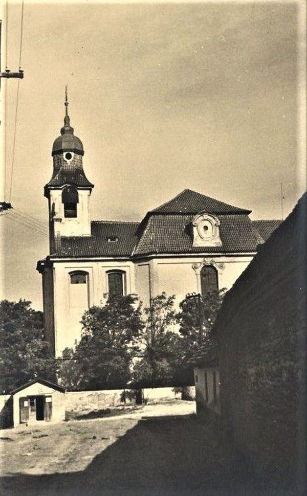 Základy kostela sv. Martina. U pravého předního rohu stávala trafika. Vzadu za pravým rohem leží základy obecné školy.