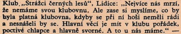 A když budeme chtít, uslyšíme třeba také, jak ozvěna nad lidickou plání stále vrací živoucí veselý klubovní pokřik Klubu Mladého hlasatele Strážci černých lesů...