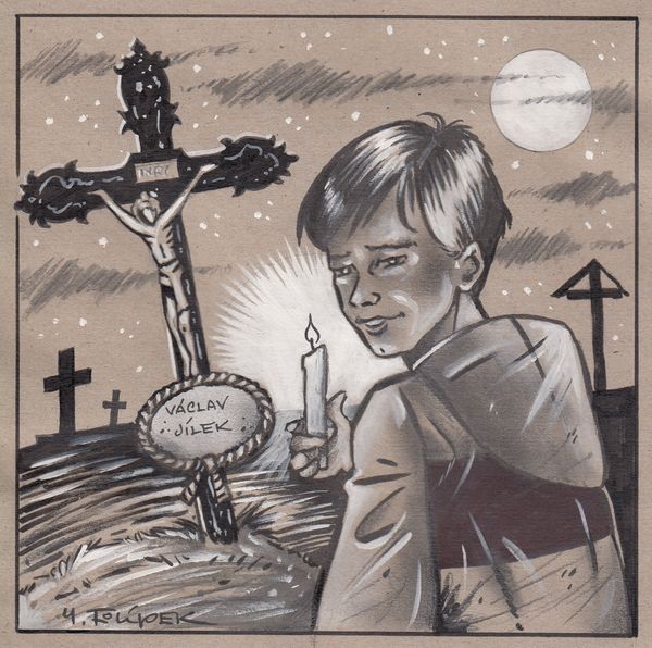 "Václava Jílka pohřbili na hřbitově ve Spálených Mlýnech. Podívejte se někdy na jeho malý chlapecký hrob. Je tam dodnes, v západním koutě hřbitova. Nápis na kříži už skoro není znát, o hrob už se nikdo nestará, když teď nejsou naživu Jílkovi rodiče." - Z vyprávění lékárníka pana Vošahlíka o tragické události před čtvrt století v kraji šafránové vůně Pavlu Zemanovi, který se potom vydal na hřbitov a skutečně tam nalezl malý polorozpadlý hrob s omšelým křížem a s téměř nečitelným nápisem...Setmělé hroby v okolní záplavě světel právě jen na Vánoce a o Dušičkách působí posmutněle. Od dětství jsme na hřbitovy v takové dny nosili vždy aspoň o jednu svíčku více a zapálili ji na nějakém cizím hrobě, kam zrovna nikdo nepřišel, nebo viditelně už nebyl nikdo, kdo by kdy chodil. Možná je takové opuštěné setmělé místo posledního odpočinku neznámého člověka i při vánoční cestě za vzpomínkou k blízkým někoho z čtenářů - a možná má v kapse jednu svíčku navíc... Za nakreslení patří dík Jiřímu Filípkovi – Jeepovi, který, jako vždy, velmi vstřícně usedl k pracovnímu stolu a začal bez řečí tvořit ve prospěch vánočního světla na opuštěných hrobech.