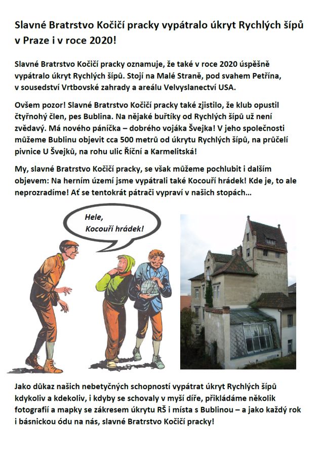 Dnes skončila tradiční hra Hledáme Rychlé šípy, kterou pražská pobočka SPJF pořádá tradičně od roku 2001. Celkové výsledky a zpravodajství přineseme ve zvláštním článku, zatím zveřejňujeme dopis Bratrstva kočičí pracky, který osvětluje, kde letos byly Rychlé šípy před zraky zvídavých čtenářů foglarovek ukryty.