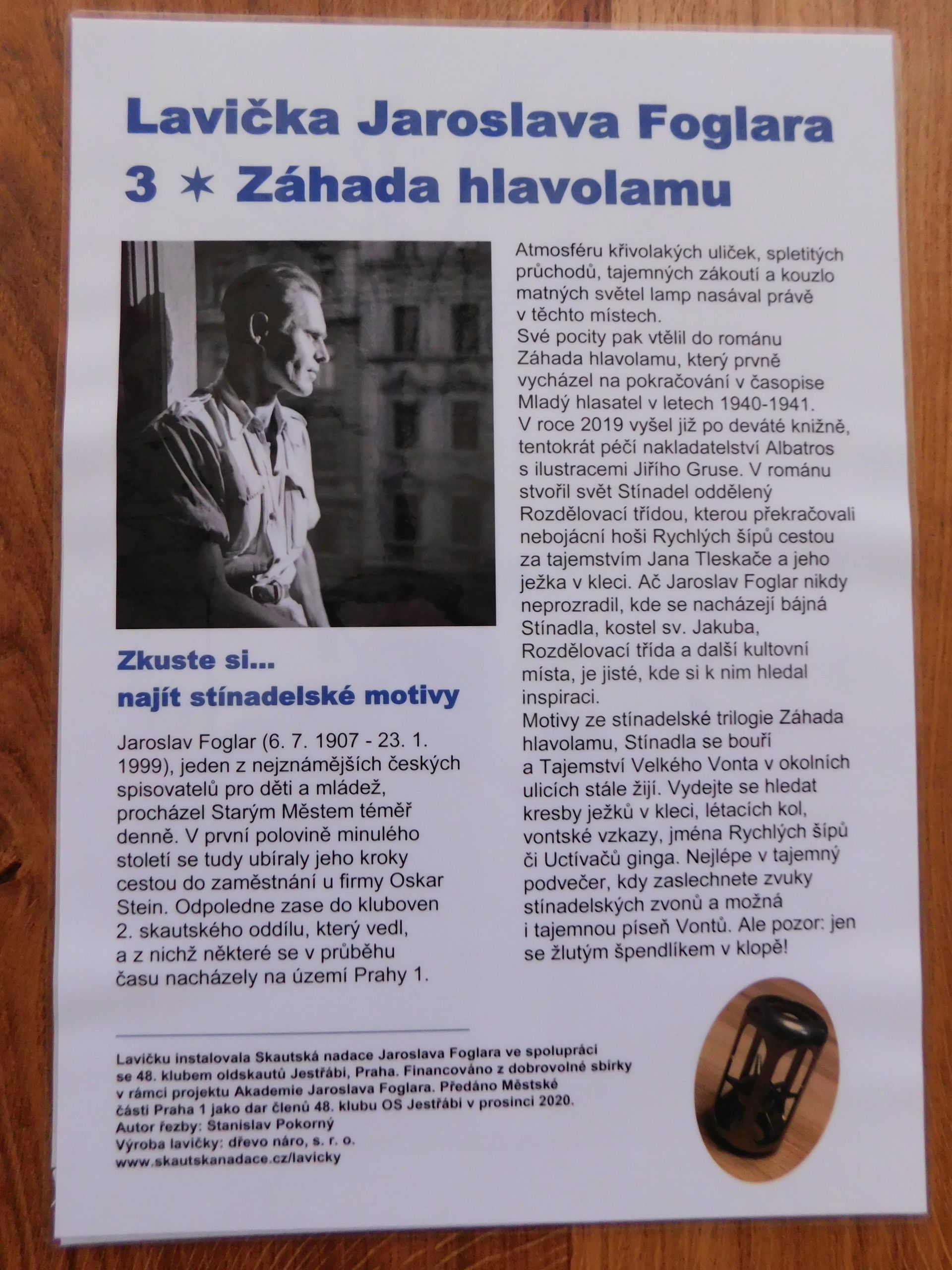 Vyřezávaná lavička na motiv románu Jaroslava Foglara Záhada hlavolamu je v ulici Za Haštalem[ Autor: Bohoušek | zařazeno: 23. 12. 2020 | přečteno 10039 ] Originální vyřezávaná lavička na motiv románu Jaroslava Foglara Záhada hlavolamu byla 16. prosince 2020 odpoledne slavnostně uvedena do užívání na dětském hřišti na konci slepé ulice Za Haštalem v Praze 1. Stalo se tak za přítomnosti Skautské nadace Jaroslava Foglara, Akademie Jaroslava Foglara, 48. klubu oldskautů Jestřábi, Sdružení přátel Jaroslava Foglara a starosty a místostarostky Městské části Praha 1 a dalších účastníků z řad veřejnosti.