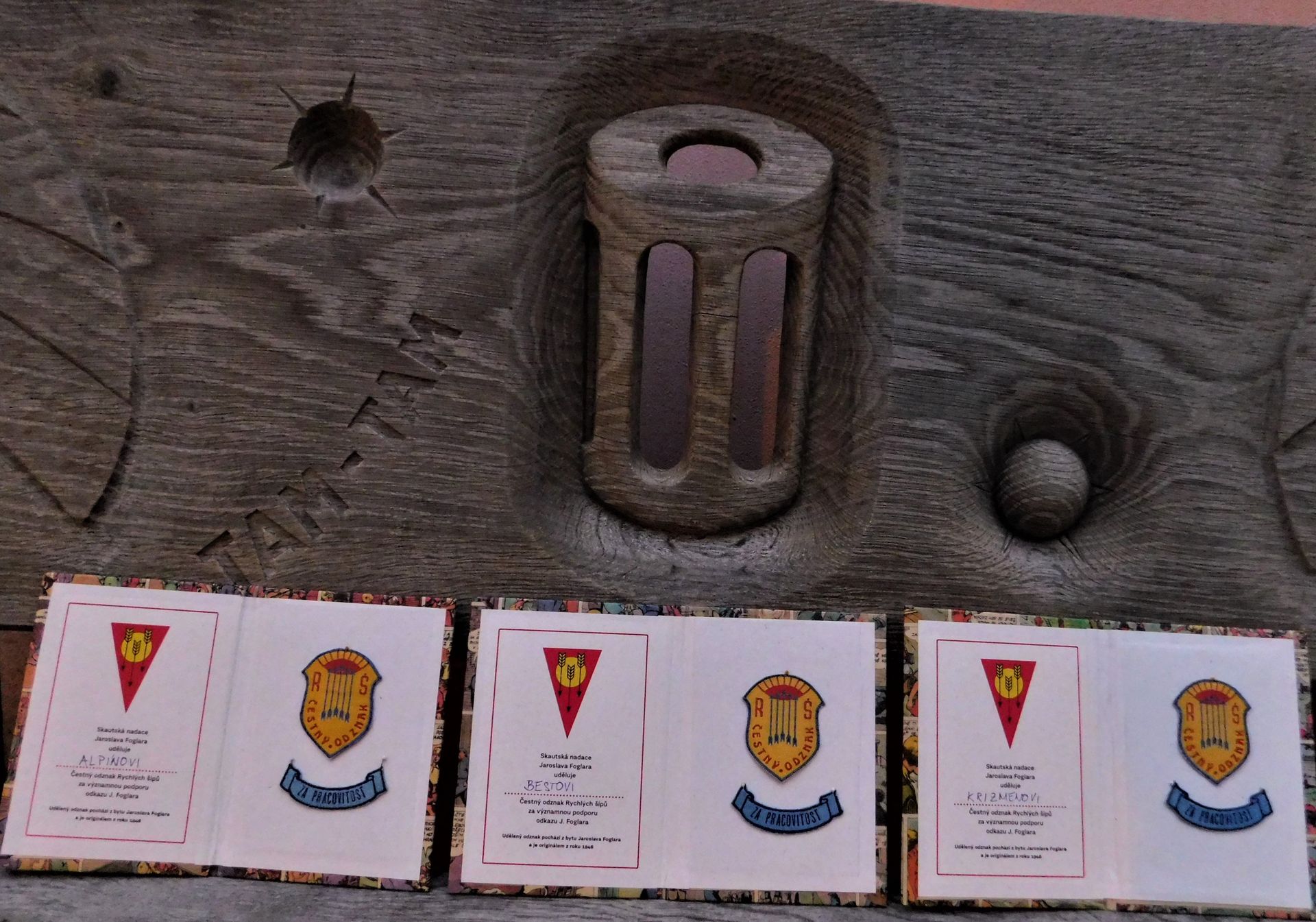 Vytvoření lavičky finančně podpořili příznivci a obdivovatelé díla pražského rodáka, spisovatele, redaktora a dlouholetého vedoucího skautského oddílu Pražská Dvojka (Hoši od Bobří řeky) známého i pod přezdívkou Jestřáb.První dvě „románové“ vyřezávané lavičky byly pokřtěny předloni 10. 9. 2018: lavička Hoši od Bobří řeky v Riegrových sadech na dětském hřišti U Draka (GPS 50.0808094N, 14.4433222E), lavička Chata v Jezerní kotlině v Havlíčkových sadech na dětském hřiště U Štiky (GPS 50.0687608N, 14.4482036E). Letos 8. 9. přibyla lavička Boj o první místo na dětském hřišti U Malé říčky (GPS 50.1080797N, 14.4133142E) ve Stromovce. V současnosti se připravuje další lavička - Tajemná Řásnovka, a to na Vinohradech. V rámci akce Skautská nadace Jaroslava Foglara udělila při příležitosti narozenin Rychlých šípů první, novodobé Čestné odznaky Rychlých šípů za pracovitost! Oceněni byli: Redakce Bohousek.cz (konkrétně Milan Lebeda - Alpín, Petr Moka - Best a Tomáš Hromádka - Krizmen) za dvacetileté neúnavné informování o novinkách ze světa Jaroslava Foglara. Martin T. Pecina za grafický přínos k úpravě díla Jaroslava Foglara a za grafickou úpravu předmětů SNJF. Jiří Grus za ilustrace ke stínadelské trilogii, ke kterým přistoupil s neuvěřitelným nasazením a tvůrčím umem. Pavel Trantina - Goblin za vedení správní rady Skautské nadace Jaroslava Foglara a dlouholetou, téměř dvacetiletou podporu jejího fungování. Součástí ocenění je Čestný odznak Rychlých šípů z roku 1946, které se zachovaly v bytě Jaroslava Foglara. Poznámka redakce: Bohoušek samozřejmě od srdce děkuje, ocenění si váží a má radost. Stejně jako děkuje svým čtenářům, váží si jejich přízně a má z ní radost. Dlužno dodat, že Bohoušek by nebyl tím, čím snad je, bez řady dalších ochotných přispěvatelů - a i jim patří velký dík! Tak vzhůru do další dvacítky let! Foto: Milan Lebeda - Alpín Kliknutím na fotografie se jejich náhled zvětší.