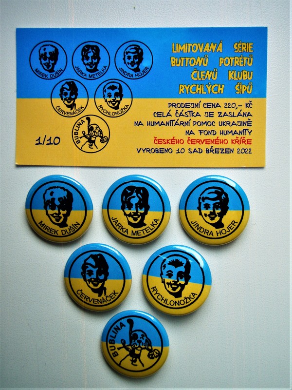 V souvislosti se situací právě na Ukrajině máme sdělení pro sběratele: Z iniciativy foglarovce Eduarda Pazourka vychází limitovaná série deseti sad buttonů s portréty Rychlých šípů ve žlutomodrém provedení, přičemž veškerý výnos z prodeje bude věnován na pomoc Ukrajině. Několik sad je stále ještě k dispozici, objednat lze na adrese www.razitka.eu.