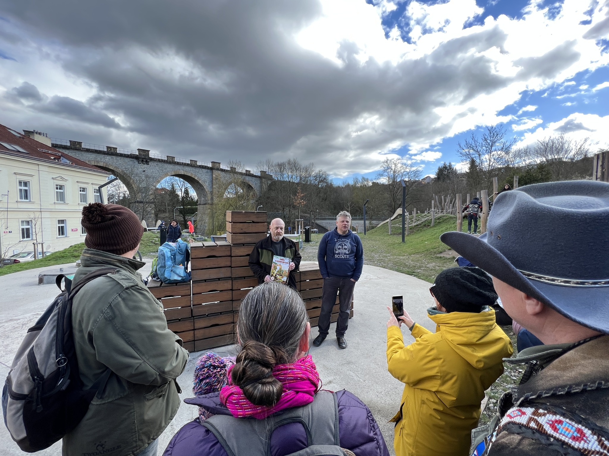 Na dětském hřišti u viaduktu v pražských Hlubočepích v sobotu 25. 3. 2023 odpoledne po uvedení do provozu nové dřevěné vyřezávané lavičky Jaroslava Foglara Milan Lebeda - Alpín s Romanem Šantorou – Bobem ze Skautské nadace Jaroslava Foglara pokřtili šafránem před dřevěnými bedničkami (Proč šafrán a proč bedničky? - Znalí vědí!) nové jarem vonící vydání komiksové Chaty v Jezerní kotlině Jaroslava Foglara a Marko Čermáka.