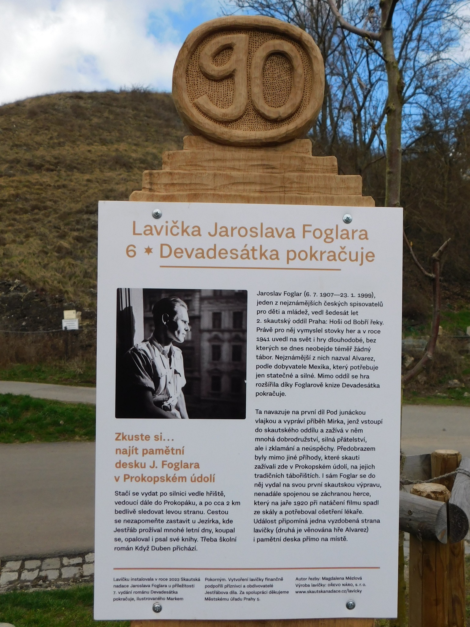 V pořadí již šestá dřevěná vyřezávaná lavička Jaroslava Foglara byla dána k užívání v sobotu 25. 3. 2023. Tentokrát na dětském hřišti v pražských Hlubočepích vedle viaduktu u rozcestí ulic K Dalejím a Na Placích v Prokopském údolí, kde prožil svoji první skautskou výpravu třináctiletý Jaroslav Foglar už v roce 1920. Později se Prokopské údolí stalo nejčastějším místem výprav skautského oddílu Pražská Dvojka (Hoši od Bobří řeky) již pod vedením právě samotného Jaroslava Foglara – Jestřába. Za Skautskou nadaci Jaroslava Foglara předal lavičku veřejnosti Roman Šantora. Lavička je tentokrát oboustranná a je vytvořena s motivy z románu Devadesátka pokračuje, s motivy Alvareze (dlouhodobá oddílová hra z románu) a s motivy ze zážitku třináctiletého J. Foglara z Prokopského údolí.