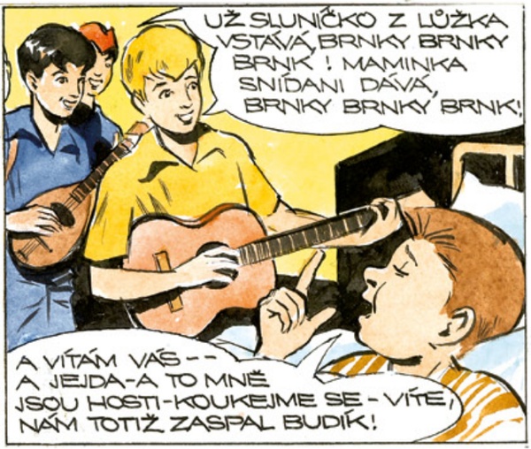 - Na všeobecně známém obrázku kráčející pětice Rychlých šípů s Bublinou hraje Mirek Dušín na kytaru.