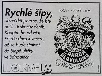 30 let filmu Záhada hlavolamu[ Autor: Tomáš Hromádka - Krizmen | zařazeno: 13. 5. 2023 | přečteno 9701 ] Před třiceti lety (13. května 1993) byl v pražském kině 64 U Hradeb premiérově uveden film režiséra Petra Kotka na motivy knihy Jaroslava Foglara Záhada hlavolamu. Slavnostní akci předcházelo samotné natáčení a zpracování filmu, které trvalo více než jeden a půl roku. Do role starého kostelníka původně režisér chtěl obsadit spisovatele Jaroslava Foglara, ze záměru však nakonec sešlo a nakonec si zde střihl svoji poslední filmovou roli herec Josef Antonín Stehlík (1907-1995). Do rolí Rychlých šípů se podařilo najít typově velmi podobné dětské herce a v rámci komparsu si zahrálo mnoho nejmladších obdivovatelů Foglarových knih. Jednu ze svých prvních rolí si zde v roli Otakara Losny zahrál Matěj Hádek, roli tajemného Ema pak herec a kaskadér Karel Engel (1940-2018), jeho syna Štěpána Mažňáka Jan Kehár, Velkého Vonta Filip Jančík (ten mimochodem namluvil knihu Záhada hlavolamu na CD), Dlouhé bidlo zase Karel Zima. A kdo hrál Rychlé šípy? Odndřej Hošt Mirka Dušína, Martin Voldřich Jarku Metelku, David Diviš Jindru Hojera, Jaroslav Richter Červenáčka a Martin Vlasák Rychlonožku.