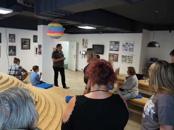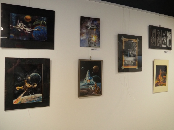 Autor svoji výstavu zahájil 1. srpna a pohovořil o všech oblastech svého tvoření - sci-fi, fantasy, komiksy, kariaktury, foglarovská tématika, ale také například parní lokomotivy a jiná témata.