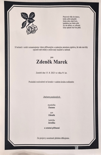 Ve věku 91 let odešel 15. srpna 2023 Zdeněk Marek - Rychlonožka. Se Zdeňkem jsem se znal od roku 1997, kdy byla výstava o Jaroslavu Foglarovi - Jestřábovi v Praze. Tam jsem se u obrazů dr. Fischera s ním a paní Fischerovou seznámil 12. června 1997 - viz barevné fotky ve Zpravodaji SPJF č. 29-30.
