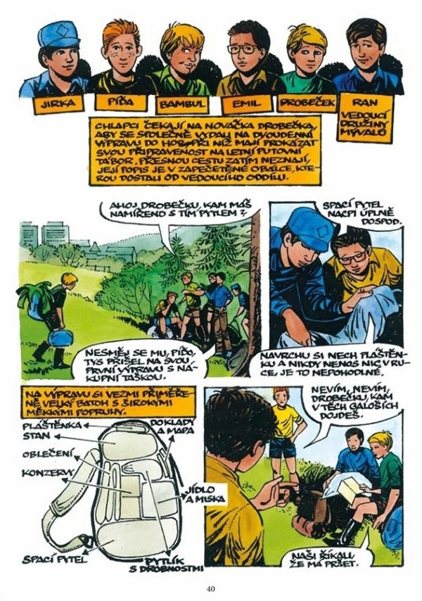 Když se začátkem ledna 1980 v týdeníku Ahoj na sobotu objevili na poslední straně v novém kresleném seriálu Stopou, stezkou, peřejí… podle scénáře Alice Hajné kamarádi Jirka, Oldřich, Mirek a Karel, nebylo to pro čtenáře časopisu vydávaného Československou stranou socialistickou ve vydavatelství Melantrich s těmito dospělými členy turistického oddílu setkání první.